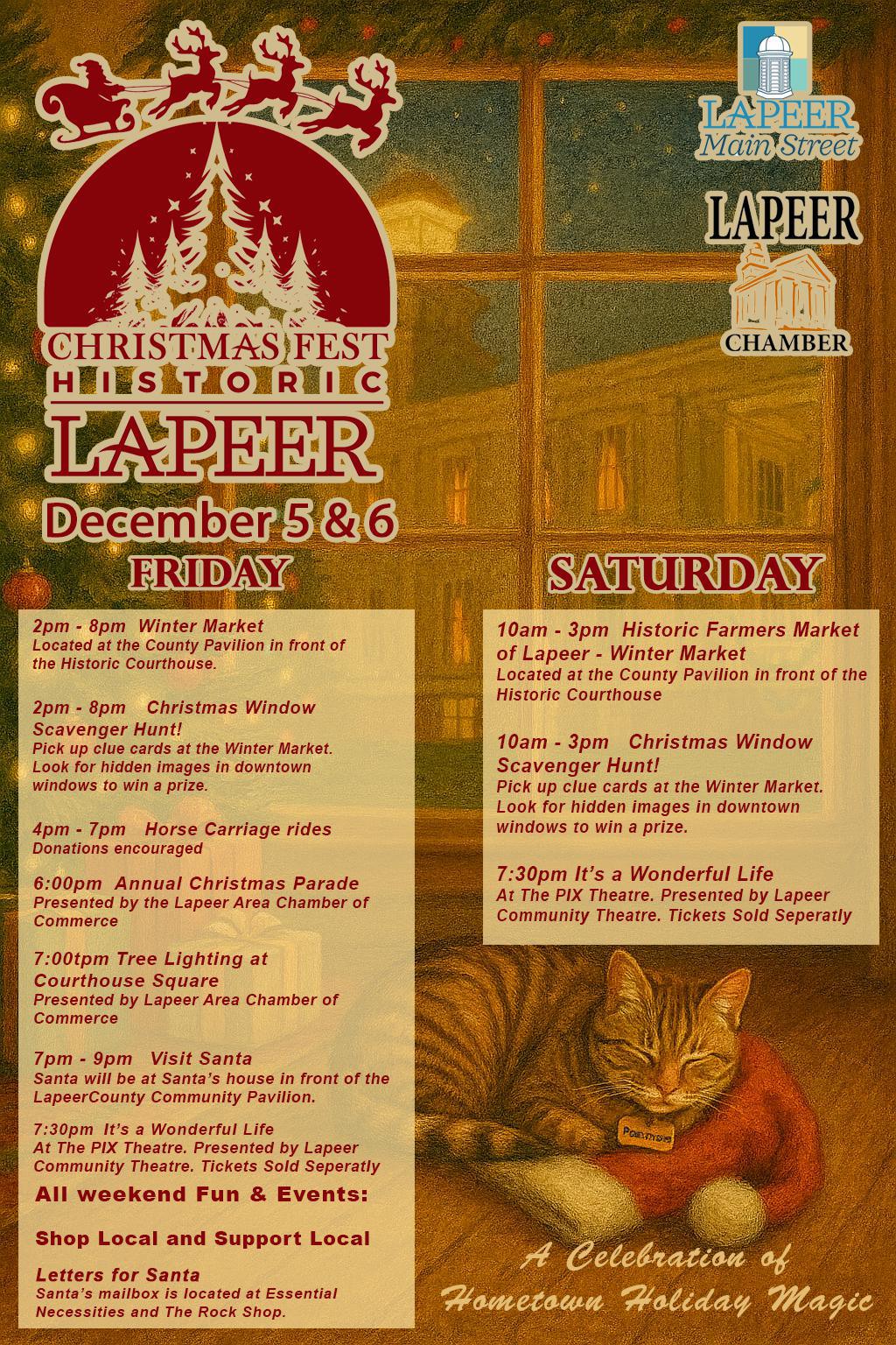 🎄 Head to Historic Downtown Lapeer for Christmas Fest on Friday, Dec 5 (2–8pm) and Saturday, Dec 6, 2025 (10am–3pm)! Enjoy a festive scavenger hunt, horse & carriage rides, a cozy winter market, and a lighted Christmas parade at 6pm with tree lighting and a visit with Santa in the Santa House in Downtown Lapeer. 🎅✨