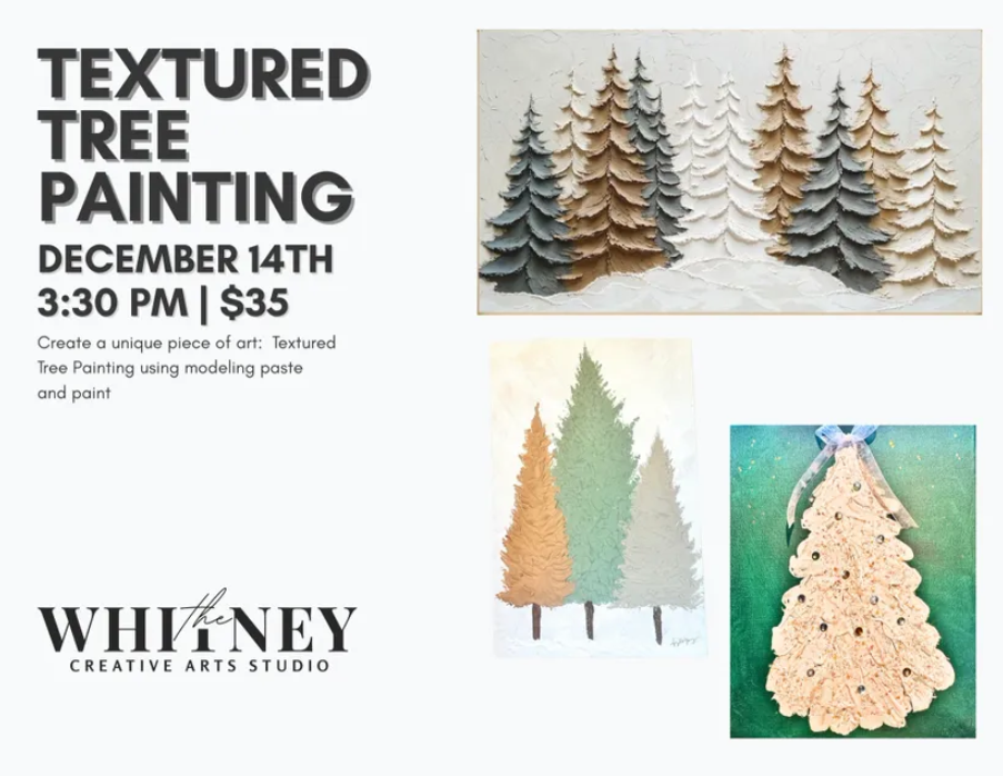 Join The Whitney CAS in Lapeer on Sunday, December 14, 2025 at 3:30 PM for a 2-hour Textured Tree Painting class for just $35. Learn how to create stunning raised tree designs using modeling paste and paint in a fun, creative setting. This workshop is nonrefundable, but if you canβt attend, a take-home kit with all supplies will be available for pickup during the week following the class. β¨ποΈ
