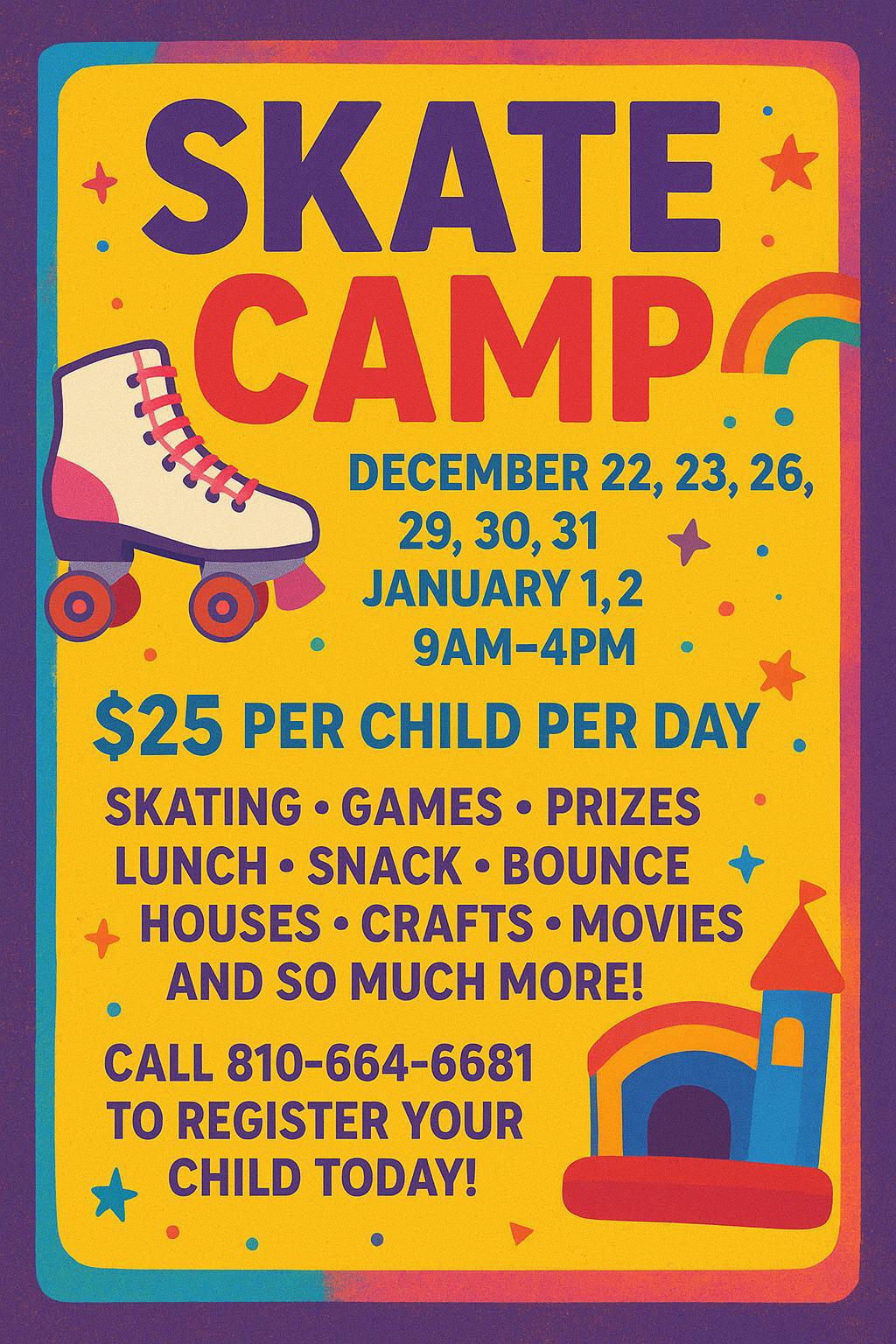 Each day is packed with excitement โ€” skating, games, prizes, lunch, snacks, bounce houses, crafts, movies, and SO much more! ๐Ÿ›ผโœจ