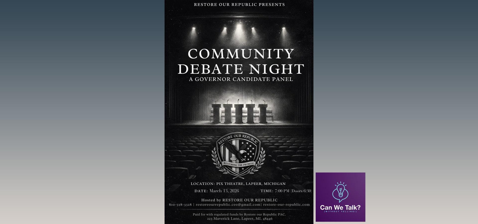 Event: Community Debate Night | Venue: PIX Theatre | City: Lapeer, Michigan