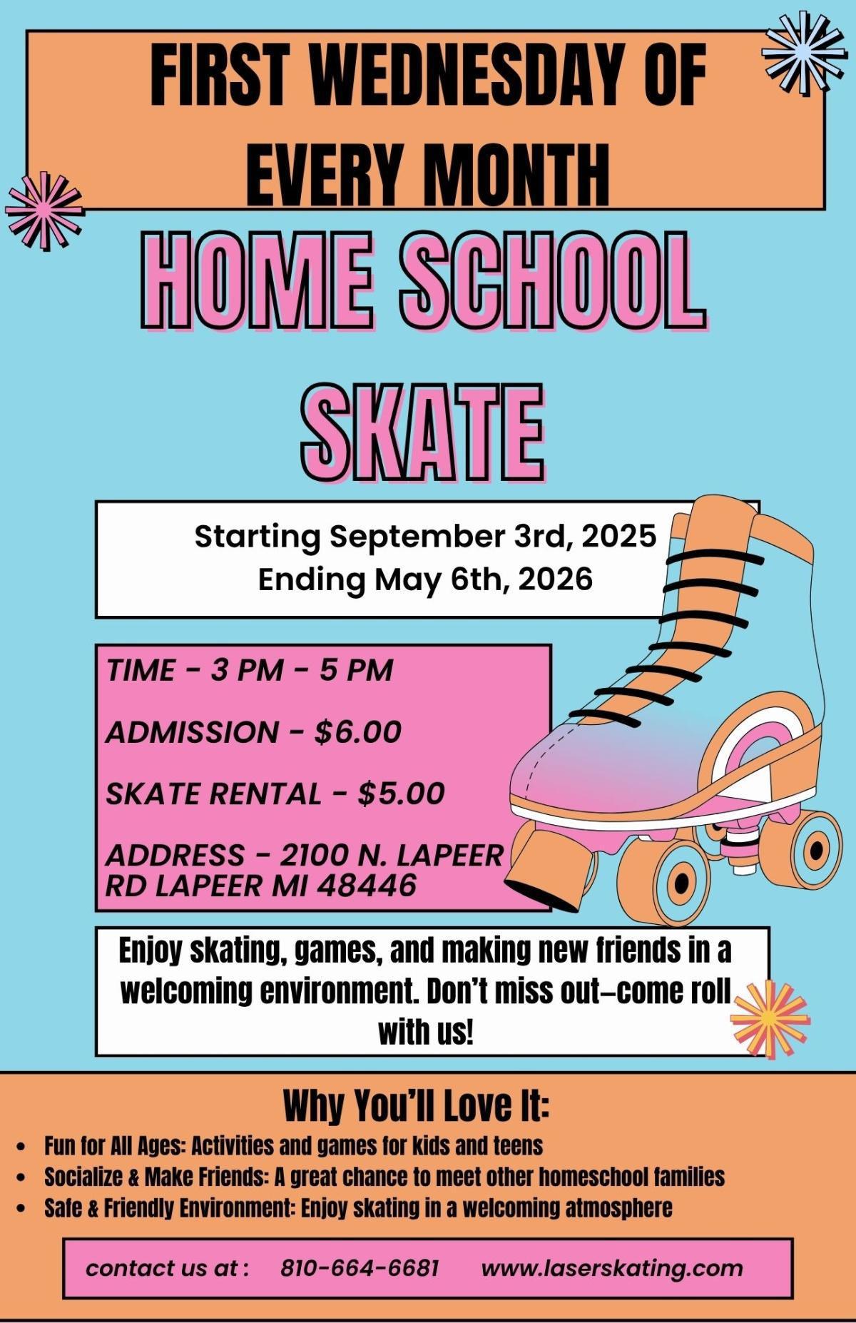 Enjoy a fun afternoon of skating, music, and community while meeting other homeschoolers in the area.
