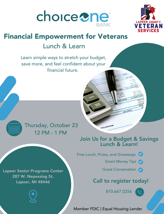 Join a free Lunch & Learn with ChoiceOne Bank & Lapeer County Veterans Services to learn simple ways to budget, save, and build confidence with your finances. 🥪🎁 Free lunch, prizes & giveaways!