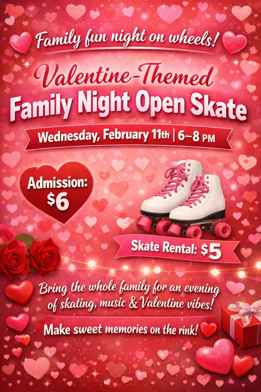 Join us for a Valentine-Themed Family Night Open Skate on Wednesday, February 11th from 6β8 PM.